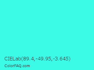 CIELab 89.4,-49.95,-3.645 Color is a light cyan color and the nearest color is Turquoise #40e0d0. Hex code #3bfae6 and RGB value is rgb(59,250,230). In RGB color space, this color is composed of 23% red, 98% green, 90% blue, In CMYK color space, this color is composed of 76% cyan, 0% magenta, 8% yellow , 2% black , In HSL color space, this color has a hue angle of 174° , 95% saturation and 61% lightness.