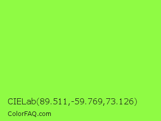 CIELab 89.511,-59.769,73.126 Color is a light green color and the nearest color is French Lime #9efd38. Hex code #8ffb44 and RGB value is rgb(143,251,68). In RGB color space, this color is composed of 56% red, 98% green, 27% blue, In CMYK color space, this color is composed of 43% cyan, 0% magenta, 73% yellow , 2% black , In HSL color space, this color has a hue angle of 95° , 96% saturation and 63% lightness.