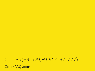 CIELab 89.529,-9.954,87.727 Color is a normal yellow color and the nearest color is Lemon #fde910. Hex code #fae30d and RGB value is rgb(250,227,13). In RGB color space, this color is composed of 98% red, 89% green, 5% blue, In CMYK color space, this color is composed of 0% cyan, 9% magenta, 95% yellow , 2% black , In HSL color space, this color has a hue angle of 54° , 96% saturation and 52% lightness.