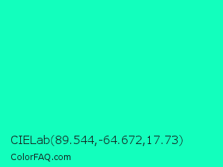 CIELab 89.544,-64.672,17.73 Color is a normal green color and the nearest color is Medium Spring Green #00fa9a. Hex code #12ffbd and RGB value is rgb(18,255,189). In RGB color space, this color is composed of 7% red, 100% green, 74% blue, In CMYK color space, this color is composed of 93% cyan, 0% magenta, 26% yellow , 0% black , In HSL color space, this color has a hue angle of 163° , 100% saturation and 54% lightness.
