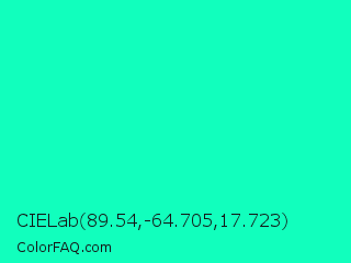 CIELab 89.54,-64.705,17.723 Color is a normal green color and the nearest color is Medium Spring Green #00fa9a. Hex code #11ffbd and RGB value is rgb(17,255,189). In RGB color space, this color is composed of 7% red, 100% green, 74% blue, In CMYK color space, this color is composed of 93% cyan, 0% magenta, 26% yellow , 0% black , In HSL color space, this color has a hue angle of 163° , 100% saturation and 53% lightness.