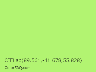 CIELab 89.561,-41.678,55.828 Color is a light green color and the nearest color is Sulu #c1f07c. Hex code #b2f471 and RGB value is rgb(178,244,113). In RGB color space, this color is composed of 70% red, 96% green, 44% blue, In CMYK color space, this color is composed of 27% cyan, 0% magenta, 54% yellow , 4% black , In HSL color space, this color has a hue angle of 90° , 86% saturation and 70% lightness.