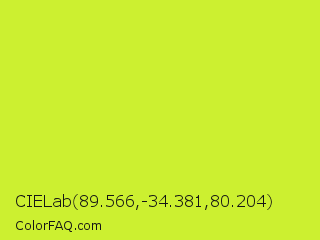 CIELab 89.566,-34.381,80.204 Color is a normal lime color and the nearest color is Pear #d1e231. Hex code #ccf030 and RGB value is rgb(204,240,48). In RGB color space, this color is composed of 80% red, 94% green, 19% blue, In CMYK color space, this color is composed of 15% cyan, 0% magenta, 80% yellow , 6% black , In HSL color space, this color has a hue angle of 71° , 86% saturation and 56% lightness.