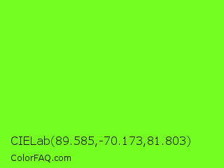 CIELab 89.585,-70.173,81.803 Color is a normal green color and the nearest color is Spring Frost #87ff2a. Hex code #75ff21 and RGB value is rgb(117,255,33). In RGB color space, this color is composed of 46% red, 100% green, 13% blue, In CMYK color space, this color is composed of 54% cyan, 0% magenta, 87% yellow , 0% black , In HSL color space, this color has a hue angle of 97° , 100% saturation and 56% lightness.