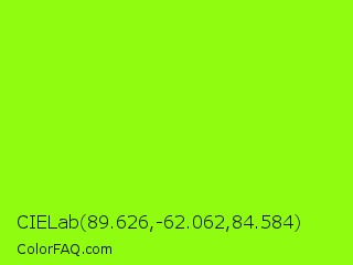 CIELab 89.626,-62.062,84.584 Color is a normal green color and the nearest color is Chartreuse #7fff00. Hex code #8ffc10 and RGB value is rgb(143,252,16). In RGB color space, this color is composed of 56% red, 99% green, 6% blue, In CMYK color space, this color is composed of 43% cyan, 0% magenta, 94% yellow , 1% black , In HSL color space, this color has a hue angle of 88° , 98% saturation and 53% lightness.