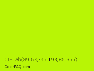 CIELab 89.63,-45.193,86.355 Color is a normal lime color and the nearest color is Lime #bfff00. Hex code #b8f505 and RGB value is rgb(184,245,5). In RGB color space, this color is composed of 72% red, 96% green, 2% blue, In CMYK color space, this color is composed of 25% cyan, 0% magenta, 98% yellow , 4% black , In HSL color space, this color has a hue angle of 75° , 96% saturation and 49% lightness.