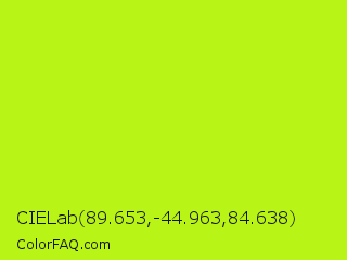 CIELab 89.653,-44.963,84.638 Color is a normal lime color and the nearest color is Inch Worm #b0e313. Hex code #b8f517 and RGB value is rgb(184,245,23). In RGB color space, this color is composed of 72% red, 96% green, 9% blue, In CMYK color space, this color is composed of 25% cyan, 0% magenta, 91% yellow , 4% black , In HSL color space, this color has a hue angle of 76° , 92% saturation and 53% lightness.
