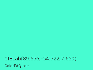 CIELab 89.656,-54.722,7.659 Color is a light cyan color and the nearest color is Turquoise #40e0d0. Hex code #47fcd1 and RGB value is rgb(71,252,209). In RGB color space, this color is composed of 28% red, 99% green, 82% blue, In CMYK color space, this color is composed of 72% cyan, 0% magenta, 17% yellow , 1% black , In HSL color space, this color has a hue angle of 166° , 97% saturation and 63% lightness.