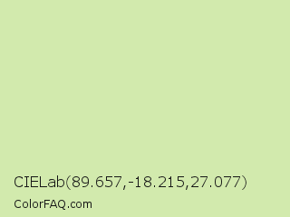 CIELab 89.657,-18.215,27.077 Color is a light green color and the nearest color is Caper #dcedb4. Hex code #d2eaad and RGB value is rgb(210,234,173). In RGB color space, this color is composed of 82% red, 92% green, 68% blue, In CMYK color space, this color is composed of 10% cyan, 0% magenta, 26% yellow , 8% black , In HSL color space, this color has a hue angle of 84° , 59% saturation and 80% lightness.