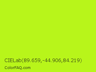CIELab 89.659,-44.906,84.219 Color is a normal lime color and the nearest color is Inch Worm #b0e313. Hex code #b8f51a and RGB value is rgb(184,245,26). In RGB color space, this color is composed of 72% red, 96% green, 10% blue, In CMYK color space, this color is composed of 25% cyan, 0% magenta, 89% yellow , 4% black , In HSL color space, this color has a hue angle of 77° , 92% saturation and 53% lightness.