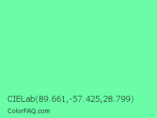 CIELab 89.661,-57.425,28.799 Color is a light green color and the nearest color is Medium Aquamarine #66ddaa. Hex code #6bfca8 and RGB value is rgb(107,252,168). In RGB color space, this color is composed of 42% red, 99% green, 66% blue, In CMYK color space, this color is composed of 58% cyan, 0% magenta, 33% yellow , 1% black , In HSL color space, this color has a hue angle of 145° , 96% saturation and 70% lightness.