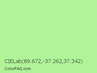 CIELab 89.672,-37.262,37.342 Color is a light green color and the nearest color is Granny Smith Apple #a8e4a0. Hex code #b0f398 and RGB value is rgb(176,243,152). In RGB color space, this color is composed of 69% red, 95% green, 60% blue, In CMYK color space, this color is composed of 28% cyan, 0% magenta, 37% yellow , 5% black , In HSL color space, this color has a hue angle of 104° , 79% saturation and 77% lightness.
