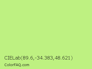 CIELab 89.6,-34.383,48.621 Color is a light green color and the nearest color is Sulu #c1f07c. Hex code #bef181 and RGB value is rgb(190,241,129). In RGB color space, this color is composed of 75% red, 95% green, 51% blue, In CMYK color space, this color is composed of 21% cyan, 0% magenta, 46% yellow , 5% black , In HSL color space, this color has a hue angle of 87° , 80% saturation and 73% lightness.