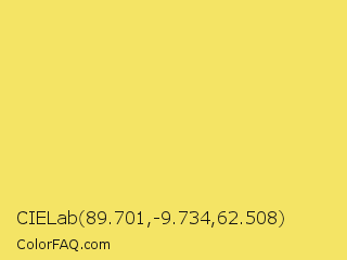 CIELab 89.701,-9.734,62.508 Color is a light yellow color and the nearest color is Portica #f9e663. Hex code #f4e465 and RGB value is rgb(244,228,101). In RGB color space, this color is composed of 96% red, 89% green, 40% blue, In CMYK color space, this color is composed of 0% cyan, 7% magenta, 59% yellow , 4% black , In HSL color space, this color has a hue angle of 53° , 87% saturation and 68% lightness.
