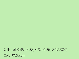 CIELab 89.702,-25.498,24.908 Color is a very light green color and the nearest color is Madang #b7f0be. Hex code #c1eeb1 and RGB value is rgb(193,238,177). In RGB color space, this color is composed of 76% red, 93% green, 69% blue, In CMYK color space, this color is composed of 19% cyan, 0% magenta, 26% yellow , 7% black , In HSL color space, this color has a hue angle of 104° , 64% saturation and 81% lightness.
