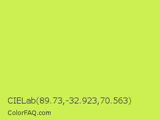 CIELab 89.73,-32.923,70.563 Color is a light lime color and the nearest color is Maximum Green Yellow #d9e650. Hex code #ccf04f and RGB value is rgb(204,240,79). In RGB color space, this color is composed of 80% red, 94% green, 31% blue, In CMYK color space, this color is composed of 15% cyan, 0% magenta, 67% yellow , 6% black , In HSL color space, this color has a hue angle of 73° , 84% saturation and 63% lightness.