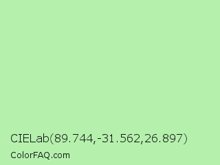 CIELab 89.744,-31.562,26.897 Color is a very light green color and the nearest color is Madang #b7f0be. Hex code #b5f1ad and RGB value is rgb(181,241,173). In RGB color space, this color is composed of 71% red, 95% green, 68% blue, In CMYK color space, this color is composed of 25% cyan, 0% magenta, 28% yellow , 5% black , In HSL color space, this color has a hue angle of 113° , 71% saturation and 81% lightness.