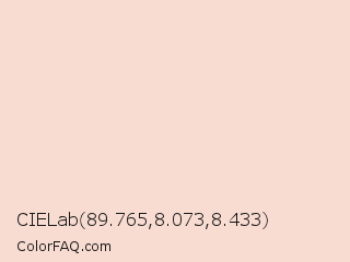 CIELab 89.765,8.073,8.433 Color is a very light orange color and the nearest color is Champagne Pink #f1ddcf. Hex code #f8dcd2 and RGB value is rgb(248,220,210). In RGB color space, this color is composed of 97% red, 86% green, 82% blue, In CMYK color space, this color is composed of 0% cyan, 11% magenta, 15% yellow , 3% black , In HSL color space, this color has a hue angle of 16° , 73% saturation and 90% lightness.