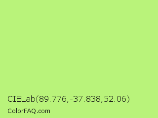CIELab 89.776,-37.838,52.06 Color is a light green color and the nearest color is Sulu #c1f07c. Hex code #b9f37a and RGB value is rgb(185,243,122). In RGB color space, this color is composed of 73% red, 95% green, 48% blue, In CMYK color space, this color is composed of 24% cyan, 0% magenta, 50% yellow , 5% black , In HSL color space, this color has a hue angle of 89° , 83% saturation and 72% lightness.