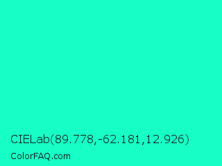 CIELab 89.778,-62.181,12.926 Color is a normal cyan color and the nearest color is Bright Turquoise #08e8de. Hex code #17ffc7 and RGB value is rgb(23,255,199). In RGB color space, this color is composed of 9% red, 100% green, 78% blue, In CMYK color space, this color is composed of 91% cyan, 0% magenta, 22% yellow , 0% black , In HSL color space, this color has a hue angle of 166° , 100% saturation and 55% lightness.