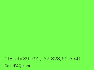 CIELab 89.791,-67.828,69.654 Color is a light green color and the nearest color is Screamin Green #66ff66. Hex code #75ff4e and RGB value is rgb(117,255,78). In RGB color space, this color is composed of 46% red, 100% green, 31% blue, In CMYK color space, this color is composed of 54% cyan, 0% magenta, 69% yellow , 0% black , In HSL color space, this color has a hue angle of 107° , 100% saturation and 65% lightness.