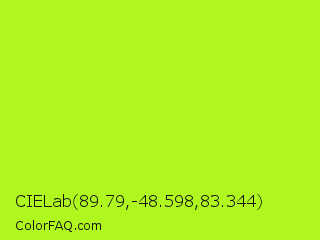 CIELab 89.79,-48.598,83.344 Color is a normal green color and the nearest color is Green Yellow #adff2f. Hex code #b0f71f and RGB value is rgb(176,247,31). In RGB color space, this color is composed of 69% red, 97% green, 12% blue, In CMYK color space, this color is composed of 29% cyan, 0% magenta, 87% yellow , 3% black , In HSL color space, this color has a hue angle of 80° , 93% saturation and 55% lightness.