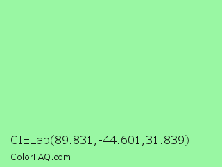 CIELab 89.831,-44.601,31.839 Color is a light green color and the nearest color is Pale Green #98fb98. Hex code #99f7a3 and RGB value is rgb(153,247,163). In RGB color space, this color is composed of 60% red, 97% green, 64% blue, In CMYK color space, this color is composed of 38% cyan, 0% magenta, 34% yellow , 3% black , In HSL color space, this color has a hue angle of 126° , 85% saturation and 78% lightness.