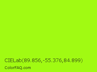 CIELab 89.856,-55.376,84.899 Color is a normal green color and the nearest color is Spring Bud #a7fc00. Hex code #a1fa12 and RGB value is rgb(161,250,18). In RGB color space, this color is composed of 63% red, 98% green, 7% blue, In CMYK color space, this color is composed of 36% cyan, 0% magenta, 93% yellow , 2% black , In HSL color space, this color has a hue angle of 83° , 96% saturation and 53% lightness.