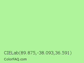 CIELab 89.875,-38.093,36.591 Color is a light green color and the nearest color is Granny Smith Apple #a8e4a0. Hex code #aef49a and RGB value is rgb(174,244,154). In RGB color space, this color is composed of 68% red, 96% green, 60% blue, In CMYK color space, this color is composed of 29% cyan, 0% magenta, 37% yellow , 4% black , In HSL color space, this color has a hue angle of 107° , 80% saturation and 78% lightness.