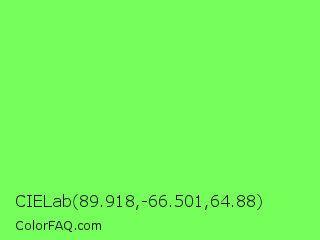 CIELab 89.918,-66.501,64.88 Color is a light green color and the nearest color is Screamin Green #66ff66. Hex code #76ff5b and RGB value is rgb(118,255,91). In RGB color space, this color is composed of 46% red, 100% green, 36% blue, In CMYK color space, this color is composed of 54% cyan, 0% magenta, 64% yellow , 0% black , In HSL color space, this color has a hue angle of 110° , 100% saturation and 68% lightness.