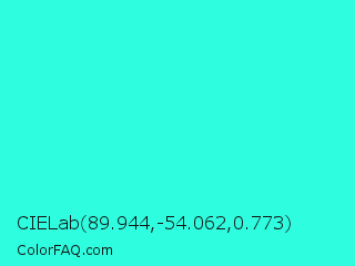 CIELab 89.944,-54.062,0.773 Color is a normal cyan color and the nearest color is Turquoise #40e0d0. Hex code #2ffddf and RGB value is rgb(47,253,223). In RGB color space, this color is composed of 18% red, 99% green, 87% blue, In CMYK color space, this color is composed of 81% cyan, 0% magenta, 12% yellow , 1% black , In HSL color space, this color has a hue angle of 171° , 98% saturation and 59% lightness.