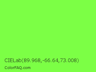 CIELab 89.968,-66.64,73.008 Color is a light green color and the nearest color is Spring Frost #87ff2a. Hex code #7cff45 and RGB value is rgb(124,255,69). In RGB color space, this color is composed of 49% red, 100% green, 27% blue, In CMYK color space, this color is composed of 51% cyan, 0% magenta, 73% yellow , 0% black , In HSL color space, this color has a hue angle of 102° , 100% saturation and 64% lightness.