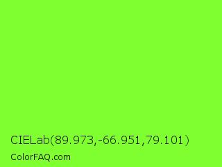 CIELab 89.973,-66.951,79.101 Color is a normal green color and the nearest color is Spring Frost #87ff2a. Hex code #7fff30 and RGB value is rgb(127,255,48). In RGB color space, this color is composed of 50% red, 100% green, 19% blue, In CMYK color space, this color is composed of 50% cyan, 0% magenta, 81% yellow , 0% black , In HSL color space, this color has a hue angle of 97° , 100% saturation and 59% lightness.
