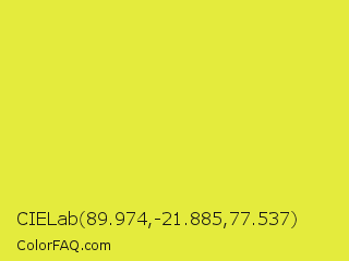 CIELab 89.974,-21.885,77.537 Color is a normal yellow color and the nearest color is Starship #ecf245. Hex code #e4eb3d and RGB value is rgb(228,235,61). In RGB color space, this color is composed of 89% red, 92% green, 24% blue, In CMYK color space, this color is composed of 3% cyan, 0% magenta, 74% yellow , 8% black , In HSL color space, this color has a hue angle of 62° , 81% saturation and 58% lightness.