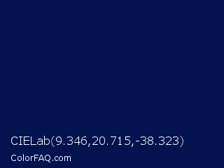 CIELab 9.346,20.715,-38.323 Color is a very dark blue color and the nearest color is Gulf Blue #051657. Hex code #02134f and RGB value is rgb(2,19,79). In RGB color space, this color is composed of 1% red, 7% green, 31% blue, In CMYK color space, this color is composed of 97% cyan, 76% magenta, 0% yellow , 69% black , In HSL color space, this color has a hue angle of 227° , 95% saturation and 16% lightness.