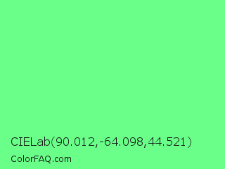 CIELab 90.012,-64.098,44.521 Color is a light green color and the nearest color is Very Light Malachite Green #64e986. Hex code #69ff89 and RGB value is rgb(105,255,137). In RGB color space, this color is composed of 41% red, 100% green, 54% blue, In CMYK color space, this color is composed of 59% cyan, 0% magenta, 46% yellow , 0% black , In HSL color space, this color has a hue angle of 133° , 100% saturation and 71% lightness.
