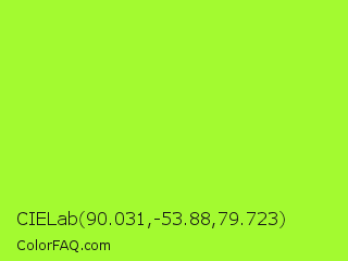 CIELab 90.031,-53.88,79.723 Color is a normal green color and the nearest color is Green Lizard #a7f432. Hex code #a3fa30 and RGB value is rgb(163,250,48). In RGB color space, this color is composed of 64% red, 98% green, 19% blue, In CMYK color space, this color is composed of 35% cyan, 0% magenta, 81% yellow , 2% black , In HSL color space, this color has a hue angle of 86° , 95% saturation and 58% lightness.