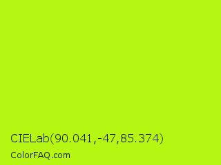 CIELab 90.041,-47,85.374 Color is a normal lime color and the nearest color is Inch Worm #b0e313. Hex code #b5f713 and RGB value is rgb(181,247,19). In RGB color space, this color is composed of 71% red, 97% green, 7% blue, In CMYK color space, this color is composed of 27% cyan, 0% magenta, 92% yellow , 3% black , In HSL color space, this color has a hue angle of 77° , 93% saturation and 52% lightness.