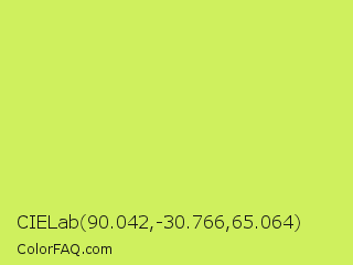 CIELab 90.042,-30.766,65.064 Color is a light lime color and the nearest color is Maximum Green Yellow #d9e650. Hex code #cff05e and RGB value is rgb(207,240,94). In RGB color space, this color is composed of 81% red, 94% green, 37% blue, In CMYK color space, this color is composed of 14% cyan, 0% magenta, 61% yellow , 6% black , In HSL color space, this color has a hue angle of 74° , 83% saturation and 65% lightness.