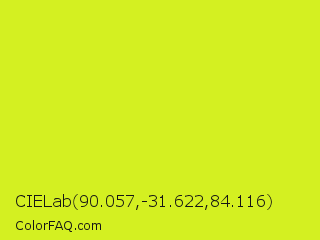 CIELab 90.057,-31.622,84.116 Color is a normal yellow color and the nearest color is Arctic Lime #d0ff14. Hex code #d4f021 and RGB value is rgb(212,240,33). In RGB color space, this color is composed of 83% red, 94% green, 13% blue, In CMYK color space, this color is composed of 12% cyan, 0% magenta, 86% yellow , 6% black , In HSL color space, this color has a hue angle of 68° , 87% saturation and 54% lightness.
