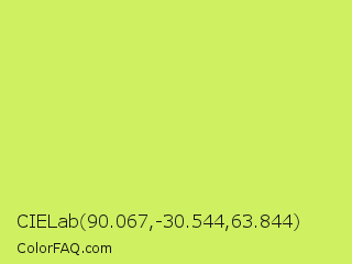 CIELab 90.067,-30.544,63.844 Color is a light lime color and the nearest color is Booger Buster #dde26a. Hex code #cff061 and RGB value is rgb(207,240,97). In RGB color space, this color is composed of 81% red, 94% green, 38% blue, In CMYK color space, this color is composed of 14% cyan, 0% magenta, 60% yellow , 6% black , In HSL color space, this color has a hue angle of 74° , 83% saturation and 66% lightness.