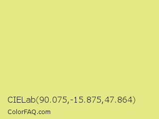 CIELab 90.075,-15.875,47.864 Color is a light yellow color and the nearest color is Sahara Sand #f1e788. Hex code #e4e985 and RGB value is rgb(228,233,133). In RGB color space, this color is composed of 89% red, 91% green, 52% blue, In CMYK color space, this color is composed of 2% cyan, 0% magenta, 43% yellow , 9% black , In HSL color space, this color has a hue angle of 63° , 69% saturation and 72% lightness.