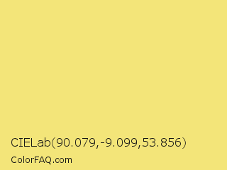 CIELab 90.079,-9.099,53.856 Color is a light yellow color and the nearest color is Mellow Yellow #f8de7e. Hex code #f3e579 and RGB value is rgb(243,229,121). In RGB color space, this color is composed of 95% red, 90% green, 47% blue, In CMYK color space, this color is composed of 0% cyan, 6% magenta, 50% yellow , 5% black , In HSL color space, this color has a hue angle of 53° , 84% saturation and 71% lightness.