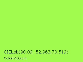 CIELab 90.09,-52.963,70.519 Color is a light green color and the nearest color is French Lime #9efd38. Hex code #a1fa4e and RGB value is rgb(161,250,78). In RGB color space, this color is composed of 63% red, 98% green, 31% blue, In CMYK color space, this color is composed of 36% cyan, 0% magenta, 69% yellow , 2% black , In HSL color space, this color has a hue angle of 91° , 95% saturation and 64% lightness.