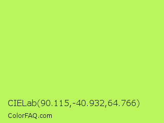 CIELab 90.115,-40.932,64.766 Color is a light green color and the nearest color is Inchworm #b2ec5d. Hex code #baf55e and RGB value is rgb(186,245,94). In RGB color space, this color is composed of 73% red, 96% green, 37% blue, In CMYK color space, this color is composed of 24% cyan, 0% magenta, 62% yellow , 4% black , In HSL color space, this color has a hue angle of 83° , 88% saturation and 66% lightness.