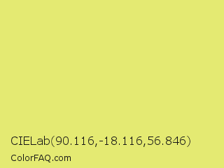 CIELab 90.116,-18.116,56.846 Color is a light yellow color and the nearest color is Manz #eeef78. Hex code #e4ea72 and RGB value is rgb(228,234,114). In RGB color space, this color is composed of 89% red, 92% green, 45% blue, In CMYK color space, this color is composed of 3% cyan, 0% magenta, 51% yellow , 8% black , In HSL color space, this color has a hue angle of 63° , 74% saturation and 68% lightness.