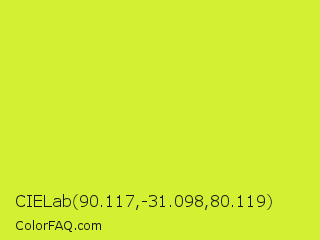 CIELab 90.117,-31.098,80.119 Color is a normal yellow color and the nearest color is Pear #d1e231. Hex code #d4f033 and RGB value is rgb(212,240,51). In RGB color space, this color is composed of 83% red, 94% green, 20% blue, In CMYK color space, this color is composed of 12% cyan, 0% magenta, 79% yellow , 6% black , In HSL color space, this color has a hue angle of 69° , 86% saturation and 57% lightness.