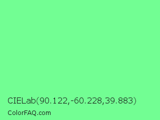 CIELab 90.122,-60.228,39.883 Color is a light green color and the nearest color is Very Light Malachite Green #64e986. Hex code #72fe93 and RGB value is rgb(114,254,147). In RGB color space, this color is composed of 45% red, 100% green, 58% blue, In CMYK color space, this color is composed of 55% cyan, 0% magenta, 42% yellow , 0% black , In HSL color space, this color has a hue angle of 134° , 99% saturation and 72% lightness.