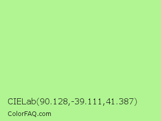 CIELab 90.128,-39.111,41.387 Color is a light green color and the nearest color is Granny Smith Apple #a8e4a0. Hex code #b0f591 and RGB value is rgb(176,245,145). In RGB color space, this color is composed of 69% red, 96% green, 57% blue, In CMYK color space, this color is composed of 28% cyan, 0% magenta, 41% yellow , 4% black , In HSL color space, this color has a hue angle of 101° , 83% saturation and 76% lightness.