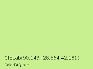 CIELab 90.143,-28.564,42.181 Color is a light green color and the nearest color is Sulu #c1f07c. Hex code #c8f090 and RGB value is rgb(200,240,144). In RGB color space, this color is composed of 78% red, 94% green, 56% blue, In CMYK color space, this color is composed of 17% cyan, 0% magenta, 40% yellow , 6% black , In HSL color space, this color has a hue angle of 85° , 76% saturation and 75% lightness.